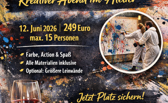 18. April 2026 – 18:00 Uhr – Bamberg Erleben Sie einen besonderen Abend voller Kreativität, Genuss und inspirierender Begegnungen beim 1. Paint & Wine in Bamberg – in der stilvollen Brasserie La Villa. In entspannter Atmosphäre treffen edle Weine auf künstlerische Freiheit und machen diesen Event zu einem unvergesslichen Erlebnis für alle […]
