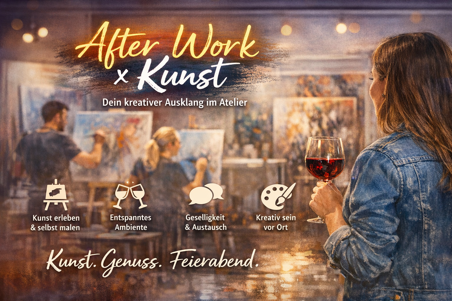Lass den Arbeitstag hinter dir und tauche ein in einen Abend voller Kunst, Atmosphäre und entspanntem Austausch. Bei After Work x Kunst öffnet sich das Atelier für einen besonderen Feierabend: authentisch, inspirierend und ganz ohne Schwellenangst.